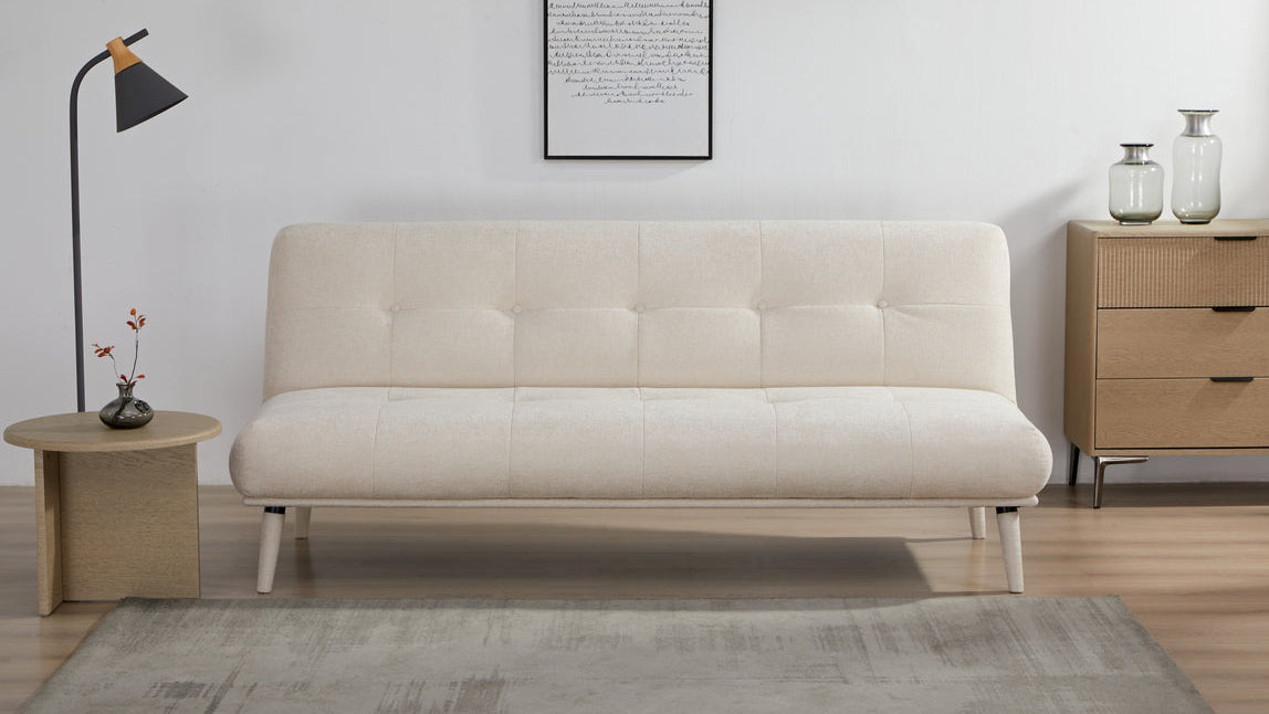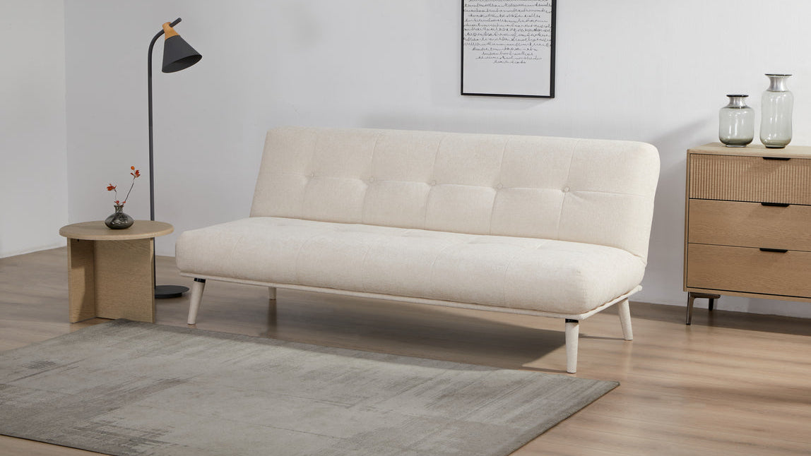 Haal het beste van twee werelden in huis met de Troonz Slaapbank Riva. Deze moderne bank in een frisse beige tint is de perfecte match voor elk interieur, van studentenkamer tot strakke woonkamer. Dankzij het slimme ontwerp zonder armleuningen oogt hij ruimtelijk en compact, terwijl de gecapitonneerde rugleuning en schuine pootjes zorgen voor een luxe uitstraling.