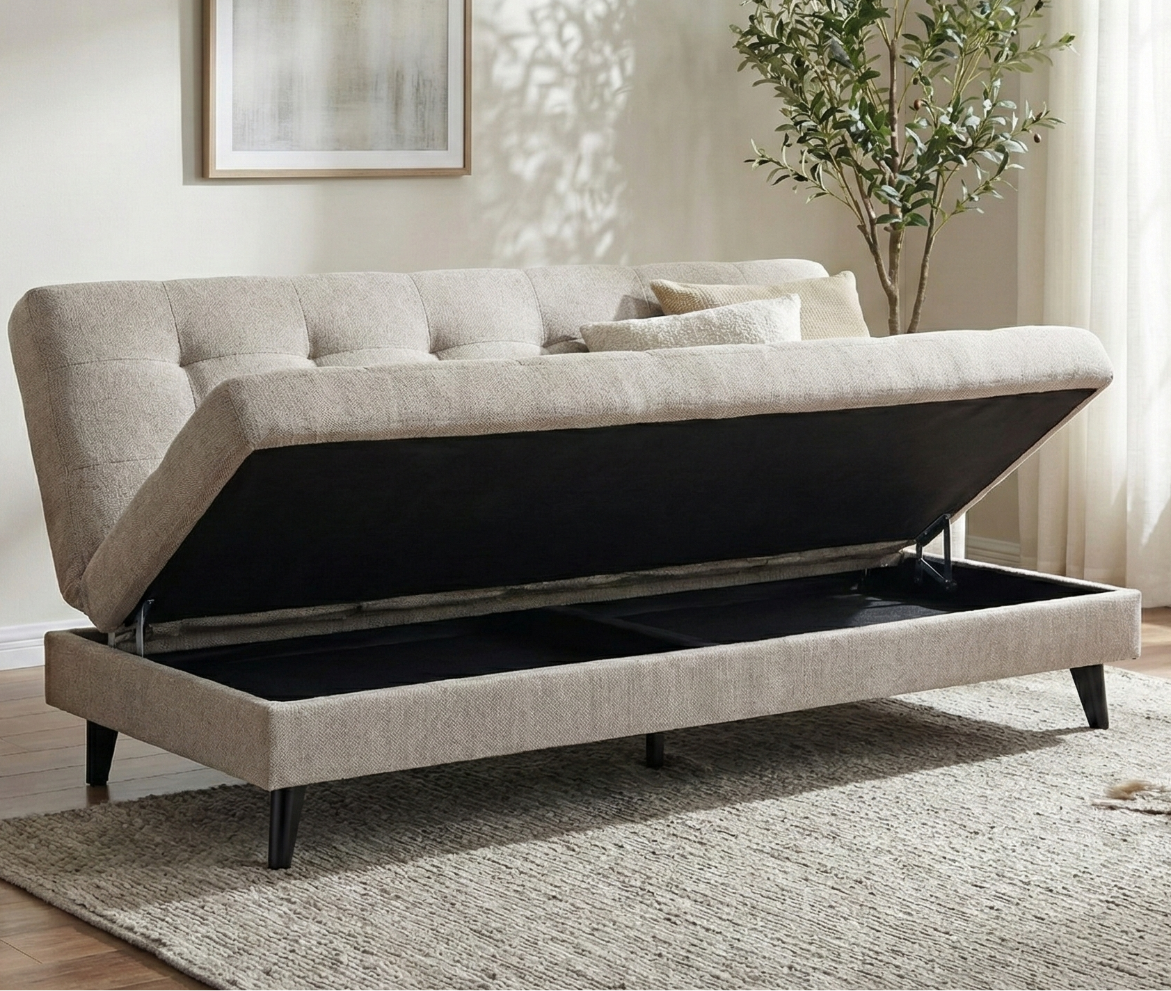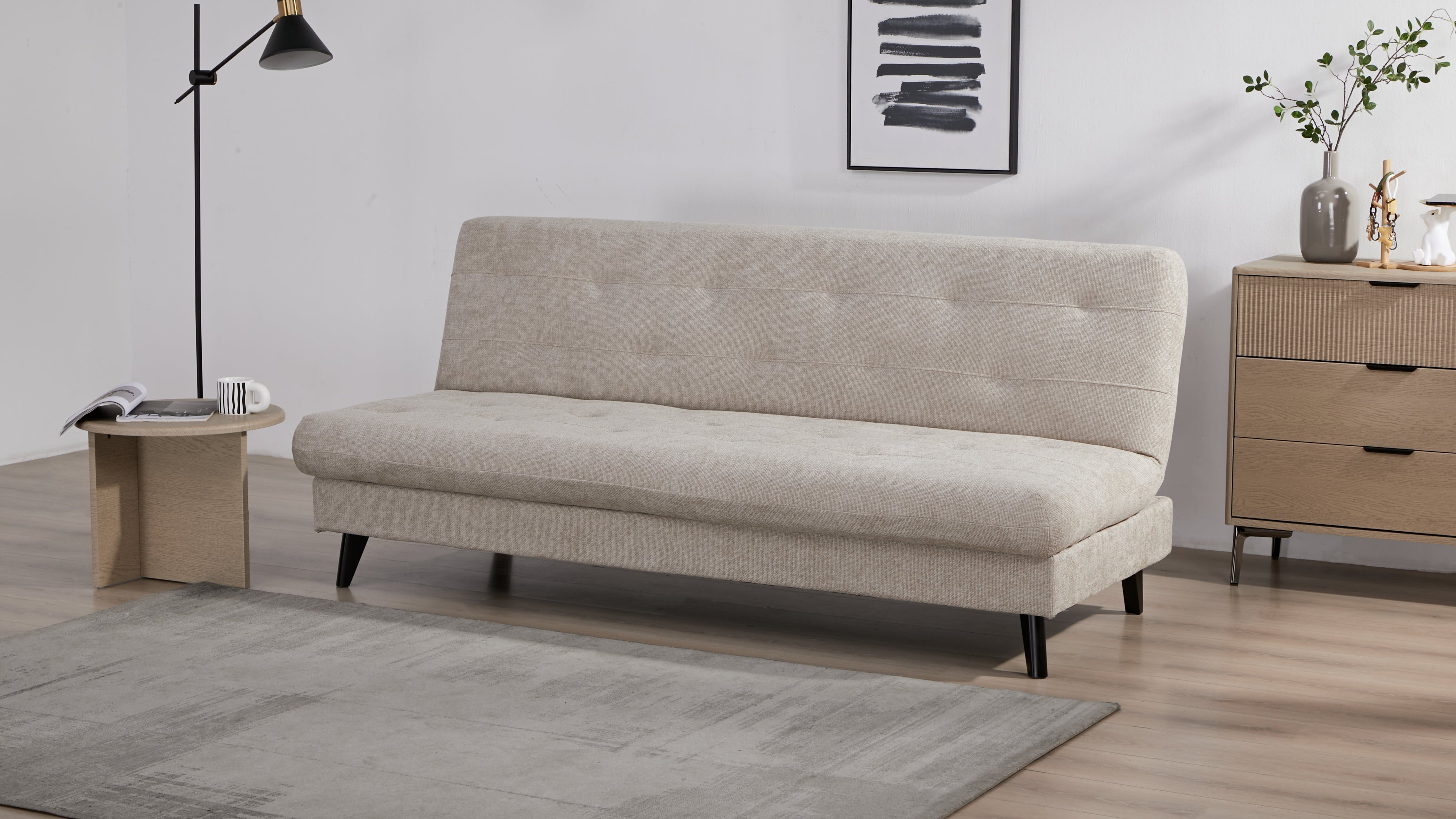 De Troonz Slaapbank Leno combineert een modern design met ultiem gebruiksgemak. Dankzij de stijlvolle beige stoffering en de strakke, zwarte poten is deze bank een rustige en tijdloze toevoeging aan elke ruimte. Maar de Leno is meer dan alleen een zitplek; blijvers zijn altijd welkom. Met het eenvoudige mechanisme tover je de bank binnen enkele seconden om tot een comfortabel bed. Je klapt de rugleuning simpelweg plat en hebt direct een fijne slaapplaats voor de nacht. Daarnaast is aan alles gedacht om je kamer netjes te houden. Onder het zitgedeelte vind je namelijk een verborgen opbergruimte, ideaal om beddengoed, kussens of dekens stofvrij en uit het zicht op te bergen.