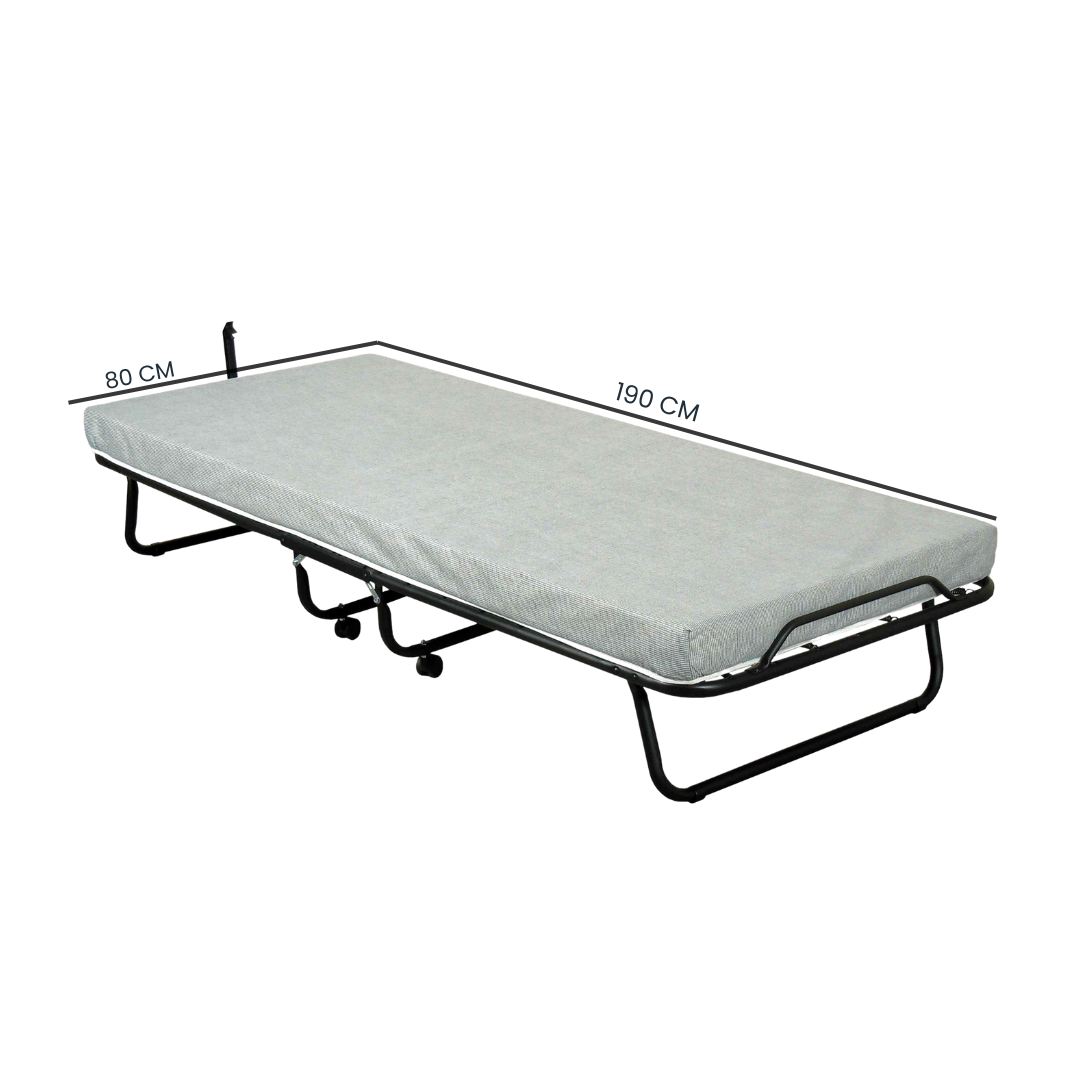 Doté d'un sommier à ressorts robuste, d'un cadre métallique robuste et d'une capacité de charge de 100 kg, ce lit est plus robuste que jamais. Véritable lit d'appoint sur roulettes , il offre confort et maniabilité. Son design compact le rend idéal pour les petits espaces et se range facilement lorsqu'il n'est pas utilisé. Une solution fiable pour les invités inattendus !